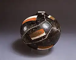 Dillingham's experience studying and repairing Native American pots, as well as his interest in anthropology influenced his own art work.[7] He was inspired by the ceramics shards of Mimbres pottery of the Mogollon cultures of the American Southwest, in particular the Mimbres perforated burial pots.[1][12][5] He was also influenced by teacher Hal Riegger and artist Beatrice Wood.[7] He is known for pioneering a process in which he hand-built a vessel, pit-fired it, deliberately broke it into shards, randomly painted both sides of each shard,[1] then refired and reassembled the individual pieces and finally added additional metallic decoration.[5][13] Dillingham's vessels were produced by coil or slab work.[2] He used traditional methods of using clay from local sources, and raku or dung firing his ceramics without a kiln.[7]