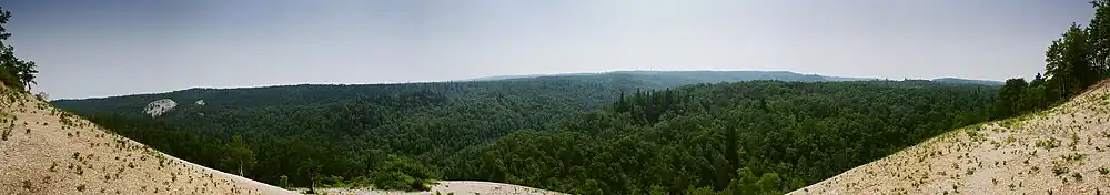 Riding Mountain National Park rises more than 457 metres (1,499 ft) over the surrounding Manitoba farmland.[28] Riding Mountain is the highest point in the region, bordered by the Manitoba Escarpment in the east, the Valley River and Wilson River in the North, and a valley in the west. Further to the west is the Saskatchewan Plain.[29]