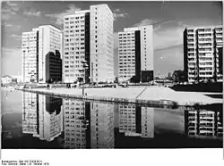 The Rieth is connected to the Erfurt city centre by Erfurt Stadtbahn tram lines 1 and 6. The name Rieth frequently appears in Thuringia as a component of place names. These are river floodplains reclaimed in the Middle Ages, which had previously become marshy and had been drained. Today's Rieth district is also located in such a floodplain between the Gera River in the west and the river Schmale Gera in the east. The Rieth was the first GDR housing estate with a complex centre in its centre, but the Johannesplatz was the first prefabricated housing estate to be built in Erfurt in 1965.