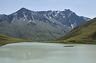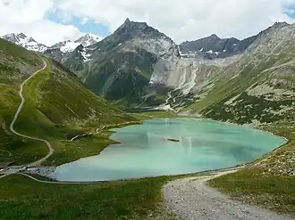 Rifflsee is a lake of Tyrol, Austria.[2] It is the largest lake in the Ötztal Alps. The mountain lake is located in the Kaunergrat west of the Pitztal and is a typical moraine reservoir. The lake fills an extensive valley, the glacier-turbid water looks greenish. It is framed in the north and west by rugged peaks of the Kaunergrat, particularly striking are Seekogel and Rostizkogel. In sunny and warm weather, a considerable amount of melt water is supplied by the Seekarles, Loch, and Rifflferner.