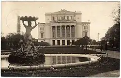 The origins of the Riga City Theatre date back to 1782, when the 500-seat Riga City Theatre House, designed by Haberland, was opened, its director Otto Hermann von Füttinghoff-Schöll maintained a large symphony orchestra of 24 musicians at his own expense, and when the Muses Society bought the building in 1815, the building became known as the Muses House. In 1837-1839, Richard Wagner was the theatre's Kapellmeister. In 1860-1863, a new theatre building was built in Riga with almost 2000 seats, which opened with productions of Friedrich Schiller's Wallenstein's Camp and Ludwig van Beethoven's Fidelio. Designed by the architect Ludwig Bonstet (1822-1885) as a Hellenised Classical building, the building was rebuilt in 1882-1887 to a design by the city architect Reinhold Schmeling after it burnt down in a fire. The theatre was closed down during the First World War and only reopened as the Deutsches Stadttheater after the German troops entered Riga in 1917.