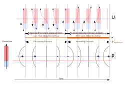 The Sondhauss tube operates in a way that is basically similar to the Rijke tube: Initially, air moves towards the hot, closed end of the tube, where it's heated, so that the pressure at that end increases. The hot, higher-pressure air then flows from the closed end towards the cooler, open end of the tube. The air transfers its heat to the tube and cools. The air surges slightly beyond the open end of the tube, briefly compressing the atmosphere; the compression propagates through the atmosphere as a sound wave. The atmosphere then pushes the air back into the tube, and the cycle repeats. Unlike the Rijke tube, the Sondhauss tube does not require a steady flow of air through it, and whereas the Rijke tube acts as a half-wave resonator, the Sondhauss tube acts as a quarter-wave resonator.[11]