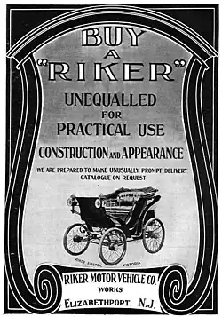 The Riker was a veteran and brass era electric car founded in 1898 in Elizabeth, New Jersey. Designed by Andrew L. Riker, they were built in small numbers until the company was absorbed by the Electric Vehicle Company in 1901.[1][2]