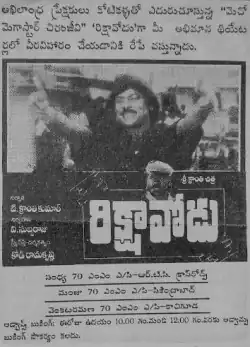 Rikshavodu (transl.Rickshaw puller) is a 1995 Telugu language film starring Chiranjeevi, Nagma and Soundarya, directed by Kodi Ramakrishna and produced by Kranthi Kumar. Chiranjeevi played a dual role in the film.[1] It was dubbed in Hindi as Devaa The Power Man and in Tamil as Veeraputhran.[2][3]