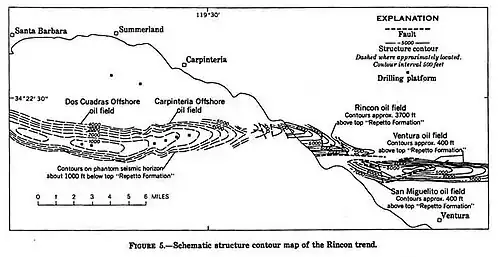 The Rincon field is at the western end of the Ventura Anticline, a long narrow structure rather like the gabled roof on a long house, beneath which petroleum has collected in abundance. Two other similar onshore fields follow the anticline: the San Miguelito field to the southeast and the huge Ventura Oil Field beyond the San Miguelito, directly north of the city of Ventura. West of the Rincon field the anticline continues offshore, containing in the Carpinteria offshore field and the Dos Cuadras field, the source of the notorious 1969 oil spill. The surface geology of the Rincon field is distinctive, including some of the most landslide-prone terrain in California; much of the surface consists of Holocene sedimentary landslide deposits, greatly prone to renewed landslides.[3]