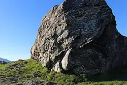 A number of rare and endangered plant species inhabit Ring Mountain.[4] The mountain's twin summits consist of serpentinite,[5] a rock which is very high in magnesium, producing soils of unusual chemistry (serpentine soil). The landscape is strewn with many sizable boulders which exhibit a variety of lithologies including high-pressure metamorphic rocks of amphibolite, blueschist, greenschist, and eclogite grade.[6]