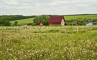 The desired place for living is chosen individually in nature, and a "love space" is established on it as the kinship homestead, opening "Heaven on Earth".[59] Many kinship homesteads of one hectare of land may constitute larger kinship settlements (родовое поселение, rodovoye poseleniye), or ecovillages,[99] such as Inberen in Sargatsky District, Omsk Oblast, the oldest and largest Anastasian settlement in Russia which was founded in 2002 and as of 2018 comprised 130 hectares of land distributed as many kinship homesteads.[100]