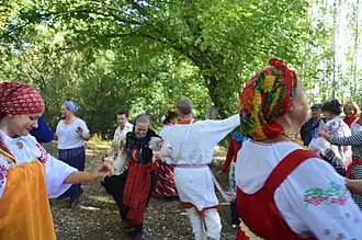 Anastasians engage in communal ceremonies and individual rituals and folk traditions, which are deemed "an obligatory component of a full life",[81] necessary to integrate the "isolated modern man".[82] Rituals for the sacralisation of the "love spaces" are crucial for most believers, a sacralisation which means making the "love space" a place where nature, the thought of God, is ideally free to unfold itself.[83] Various ritual activities are aimed at awakening the "ancestral memory" and the channels of reincarnation; they may include meditation, singing songs and playing musical instruments, composing and reciting poems, and dancing in circle.[82] Rituals of purification, performed in preparation for the holidays and the connection with the ancestors, may include bathing in icy water and then jumping three times over a bonfire, as well as walking on hot coals.[84]