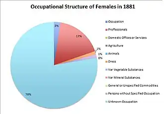 The graph of occupational structure of females in 1881, shows that 78% of females have an unknown occupation, 17% are professionals and there are a small percentage of the population in other jobs.