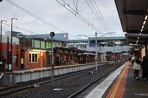 Ringwood railway station is a commuter railway station and the junction point for the Belgrave and Lilydale lines, part of the Melbourne railway network. It serves the eastern Melbourne suburb of Ringwood in Victoria, Australia. Ringwood is a ground level premium station, featuring three platforms, an island platform with two faces and one side platform, connected by an accessible overground concourse. It opened on 1 December 1882, with the current station provided in 2016.[5]