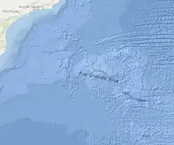 The Rio Grande Rise, also called the Rio Grande Elevation or Bromley Plateau, is an aseismic ocean ridge in the southern Atlantic Ocean off the coast of Brazil. Together with the Walvis Ridge off Africa, the Rio Grande Rise forms a V-shaped structure of mirrored hotspot tracks or seamount chains across the northern South Atlantic.[2] In 2013, Brazilian scientists announced that they found granite boulders on the Rio Grande Rise and speculated that it could be the remains of a submerged continent, which they called the "Brazilian Atlantis".[3] Other researchers, however, noted that such boulders can end-up on the ocean floor by less speculative means.[4]