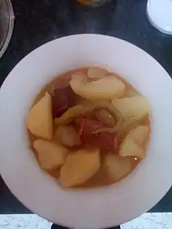 Rioja style potatoes or patatas a la Riojana is a dish from Spanish cuisine, popular in the region of La Rioja and the province of Álava in the Basque Country of Spain. It is made with bell peppers, chorizo sausage and potatoes. The sauce is simple, and thickened by the potato starch. Other ingredients like bay leaves, pimenton and mushrooms may be added.[1] Red wines complement this dish.[2]