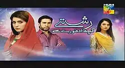 Rishtay Kuch Adhooray Se is a Pakistani drama broadcast on Hum TV that aired every Sunday at 8:00pm. It is directed by Farooq Rind and written by Nadia Akhtar. The series is produced by Momina Duraid, and the main cast includes Sohai Ali Abro, Yumna Zaidi and debutant Ali Rehman Khan with Irsa Ghazal, Mehmood Aslam and Jahanzeb Khan.[1] The show aired from August 18, 2013, to November 29, 2013, with a total of 20 episodes.[2]