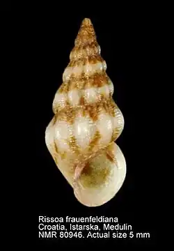 - ^ Rissoa frauenfeldiana Brusina, 1868. Gofas, S. (2009). Rissoa frauenfeldiana Brusina, 1868. In: Bouchet, P.; Gofas, S.; Rosenberg, G. World Marine Mollusca database. Accessed through the World Register of Marine Species at http://www.marinespecies.org/aphia.php?p=taxdetails&id=141350 on 9 August 2010 .