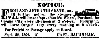 Rival's first trip was on July 4, 1860, carrying on the 110.9 ft (33.8 m) the "unbelievable"[4] number of 700 passengers from Oregon City to Vancouver, WA, a distance of 31 miles (50 km) by river,[5] which kept Captain Pease "breathing hard from the time he started until he saw them safely ashore".[1] There was a major flood of the Willamette River in late November and early December 1861. On November 30, the Rival tried to make her regular run from Oregon City to Portland, but was forced to abandon it after going only a few miles.[4] Above Willamette Falls on the same day the steamer Onward started down the river towards Salem, under George Pease, who had sold his interest in Rival to Capt. John T. Apperson, two months after Rival's completion, was now in command of Onward, and what started as a commercial venture that day for Onward turned into one of rescue, as the flood had carried away houses which were floating in the river with their occupants on the roofs.[4]