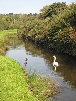 It rises in Nine Maidens Downs, directly between Hangman's Barrow to the west and the Nine Maidens stone circle to the east, in the former Kerrier District and runs to the west of the town of Helston before entering the largest natural lake in Cornwall – Loe Pool.[2] The water is impounded by the natural barrier, Loe Bar, and the river system can be traced several kilometres out into Mount's Bay.[3] Mining activity of over one hundred years in the river catchment, ceased in 1938, in the Wendron and Porkellis mining districts; and the engine house of Castle Wary (also known as Wheal Pool), near Nansloe can still be seen on the east side of the river below Helston. The lower reaches of the river were canalised in 1946 and a causeway was built over Loe Marsh in 1987.[4] The meaning of the name is uncertain, but two of the earliest records are: "in 1260 we find, 'Chohor' [alternately known as in non-unified Cornish: Dowr Coghar, meaning 'scarlet river'], due to its earlier colour from mining waste and a few years later, 'Coffar'".[5] The present name 'Cober' is unlikely to be derived from 'Coffar', since it was known as the 'River Loe or River Looe' around four hundred years ago, in Carew's time, according to the map of Powder Hundred.[6]