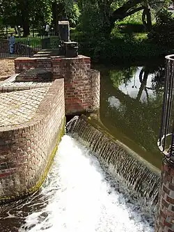 It then meanders under a road bridge at the bottom of North Hill, and tumbles down a weir used for discharge control at Middlemill, the site of a now-demolished mill. It forms the border of Colchester's Castle Park and the cricket ground, and footbridges cross it to provide access from the town centre to residential areas on the north side of the flood plain, which occasionally floods should the river rise too much. The river encircles one side of a small lake, and then turns south-east, and then south, before falling over a large weir and becoming tidal.