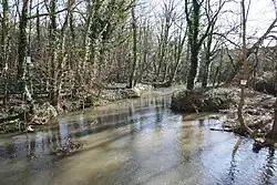 The river rises as a series of springs to the west of Kirklington, close to the 160-foot (49 m) contour. It is joined by Cotton Mill Dyke and Edingley Beck, and to the east of Kirklington, turns to flow in a south-easterly direction. Halam Beck joins from the south, and there is a disused mill at Maythorne.[3] It was built as a cotton mill in 1795 by a hop merchant, to supply yarn to the framework knitting industry. The firm of Messrs. Bean and Johnson altered it in the early nineteenth century, after which silk and lace thread was produced. A small community was established around the mill, with cottages for some of the workers, of whom there were 70 in 1838, a general store, a public house and a mission hall. Willow for making baskets was grown in osier beds, and hops were also cultivated. The building was used as a billet for soldiers during the Second World War, by which time its industrial function had ceased. It has subsequently been converted into flats, with some of the outbuildings used as industrial workshops.[4] There are two mill buildings, the north mill and the south mill, both of which are grade II listed structures.[5][6]