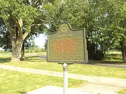 The River Raisin Battlefield Site was listed as a Michigan Historic Site on February 18, 1956, although the exact date at which the park was first organized is unknown. The location of the site is bounded by North Dixie Highway, the River Raisin, Detroit Avenue, and Mason Run Creek.[4][9] The Battle of Frenchtown is so named because it took place in and surrounding the Frenchtown Settlement (1784), on the River Raisin's north bank and within the present-day city limits of Monroe.[10] The area of conflict extended during the three days of battle several miles to the north and south of the current park site. After the battles, Frenchtown was gradually abandoned and the present-day city of Monroe developed from its downtown site 1.5 miles west and on the opposite bank of the River Raisin. The current park area encompasses some 40 acres (16 ha) of undeveloped land on Monroe's east side approximately one-quarter mile (0.4 km) west of Interstate 75. The area contains houses on the outer fringe along East Elm Avenue, and much of the area is occupied by urban development. The River Raisin Paper Company built a large paper mill on the site around 1911, which operated under multiple owners until 1995.[11]