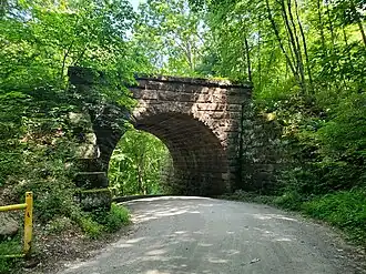 The River Road Stone Arch Railroad Bridge is a historic bridge carrying the former Air Line Railroad right-of-way over River Road in Salmon River State Forest in Colchester, Connecticut. Built in 1887, it is a well-preserved example of a period masonry railroad bridge, built as part of a state-mandated program for the reduction of the number of grade crossings in the state.[2] The bridge was listed on the National Register of Historic Places in 1986.[1]