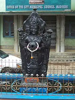 The goddess Kaveri, also known locally as Kaveriamma, is the personification of the river Kaveri. According to the Skanda Purana, during the episode of the Samudra Manthana, Vishnu assumed his ravishing female form of Mohini to offer the elixir of eternal life to the devas, and deny it to the asuras. His consort, Lakshmi, sent an apsara named Lopamudra to assist Mohini in this endeavour. Lopamudra was raised by Brahma as his adopted daughter after this event. When King Kavera propitiated Brahma for a child, the deity blessed him with Lopamudra, with the patronymic Kaveri, as his daughter, so that she would rid people of their sins and usher in fertility. When the sage Agastya wished Kaveri to marry him, she agreed, but on the condition that she would leave him if he were to ever leave her alone for too long. Agastya agreed, but one day, too occupied with his disciples, he did leave her on her lonesome for a substantial period of time. Kaveri flowed into the sage's kamandalam, and soon coursed southwards. Despite the attempts of her husband's disciples to stop her, she flowed into the ocean, and is regarded to be sacred ever since.[16]