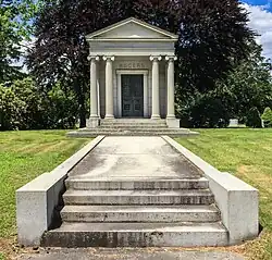 A monument designed by George F. Meacham to commemorate the soldiers and sailors from Fairhaven who had died in the Civil War was erected in the cemetery in 1868. Twenty members of the Delano family, including Warren Delano I and Warren Delano II, are buried in the Delano family tomb. The tomb was erected in 1859 and designed by Richard Morris Hunt.[2] Henry Huttleston Rogers, his wife Abbie G. Rogers, and three of their children are interred in a mausoleum erected in 1893 which was designed by Charles Brigham after an ancient temple to Minerva. Other notable burials include: