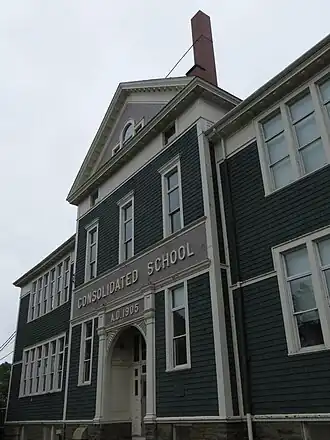 Schools in rural Canadian areas had a growing trend of becoming consolidated in the early 1900s, with New Brunswick supporting the creation of them through 1903 legislation.[3][4] $5,000 in funding for the school was provided by Abner Reid McClelan, a former Senator and Lieutenant Governor of New Brunswick,[5] with additional funding being provided by the province and through taxes.[3] Riverside Consolidated School was built in 1905, designed by architect Watson Elkinah Reid. H. Copp and Dixon, contractors from Sackville, were hired by Reid for the construction. The wooden building, measuring three storeys tall, sits next to the Shepody River.[5] Succeeding the Grammar School for Albert County,[3] the school opened in September 1905 with an initial enrollment of 275 students, serving grades 111 at the time.[6] On June 15, 1906, the school's opening ceremony began.[3] Established as a consolidated school, it previously served high school-level students.[7]