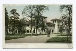 The Riverside Park Shelter House was designed by Park Superintendent J. Clyde Power in the Spanish Mission style and built between 1903 and 1904. The basement contained men's and women's golf locker rooms and a bicycle storage room, the first floor was an open dining and picnic room with a refreshment stand, the second floor contained an assembly room, and the roof featured four observation towers with views of the park. The building was also known as the Riverside Park Casino; the term “casino” was used for recreational pavilions and did not specifically connote gambling. The shelter house was demolished sometime between 1956 and 1962.[5]
