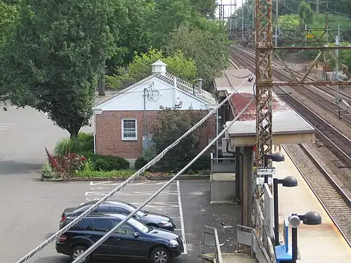 Riverside station is a commuter rail stop on the Metro-North Railroad's New Haven Line, located in the Riverside area of Greenwich, Connecticut. The Riverside Avenue Bridge crosses over the west end of the station platforms. The station has two high-level side platforms each six cars long.[3]: 20  It has 324 parking spaces, 307 owned by the state.[4]