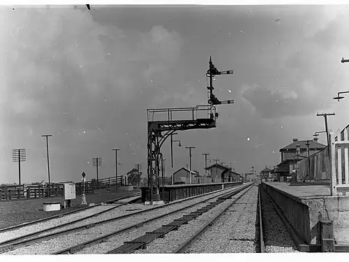 Riverton railway station opened on 21 February 1870 when the Roseworthy-Forresters railway line was extended to the towns of Manoora and Burra.[1] It became a junction station on 5 July 1918 with the opening of the branch line to Clare (later extended to Spalding in 1922). Both lines were constructed as 1,600 mm (5 ft 3 in) broad gauge.