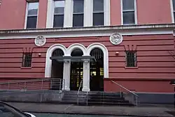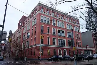 The Rivington House is located on the south side of Rivington Street between Forsyth Street and Eldridge Street on the Lower East Side. Across Forsyth Street to the west is Sara Delano Roosevelt Park. The building was constructed from 1897 to 1898, designed by architect C. B. J. Snyder in Renaissance Revival or Romanesque Revival style. Snyder, at the time the city's Superintendent of School Buildings, designed numerous other schools throughout the city.[2][3][4][5][6] The building is five stories tall, with a basement and a small sixth floor in the center of the building.[3][5] Its exterior features several decorative elements, including large stone-framed windows, several of which are arched, stone belt courses in between stories, and terracotta moldings. It also features several decorative plaques, including two at the front entrance on Rivington Street representing the New York City government. The interior, meanwhile, contains cast-iron columns with decorative elements.[3][6]