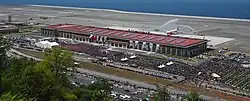 The airport is situated off the coast of Yeşilköy village in Pazar district of Rize Province.[1][2] It is 34 km (21 mi) east of Rize and about 75 km (47 mi) west of Artvin.[3] It was constructed on ground obtained through filling a part of the Black Sea shore by rocks brought from nearby quarries in Merdivenli, Hisarlı, Kanlımezra and Kuzeyce. To fill up to 30 m (98 ft)-deep sea,[3] at least 85 million tons of rock was required.[1][2][4] The airport building covers an area of 4,500 m2 (48,000 sq ft), and the runway is 3,000 m (9,800 ft) long at 45 m (148 ft) width parallel to the seashore.[2][5] The construction works began with groundbreaking in 2017. It is the country's second airport of its sort following Ordu–Giresun Airport.[2][3][5][6] It is expected that the airport will serve about two million passengers annually. The construction cost was budgeted to ₺750 million (approx. US$206 million).[5]