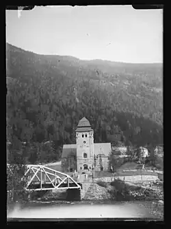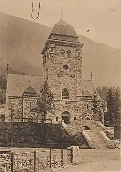 The village of Rjukan began to grow quickly during the early part of the 20th century. In 1911 residents began working towards getting a church built in the village. In 1912, a closed architectural competition for the design of the new church was held with three participants. It was won by the brothers Carl Berner and Jørgen Berner. Originally, it was intended that the church should be built by the village square, but it ended up on the Einungsdalen estate near Ingolfsland. The new church was completed in 1915 and it was consecrated on 21 December 1915. The new church had a cruciform design and it was made out of natural stone. There was a large tower at the entrance on the southwest side.[3][4]