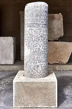 The history of road signaling in Greece dates back to Antiquity. The first road signaling included marble columns with the head of Hermes, protector of the wayfarers. Those signs were known as ἑρμαῖ ("Hermai").[3] There were also milestones for measuring street length in stadions.[4] Similar columns were also used in Roman times, but had miles as a unit of measurement.
