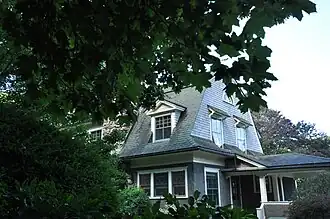 The house was built in 1907 to a design by Alfredo S.G. Taylor, a New York City-based architect who spent many summers in Norfolk. Taylor is credited with more than thirty commissions in Norfolk.[3] This house exhibits a number of signature Taylor elements, including windows with small panes in both square and diamond configurations, the half-round window in the end of the gambrel gable, and the position of the entrance at the crook of the ell. The ell, although it was added in the 1920s for a subsequent owner, was also designed by Taylor.[2]