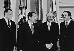 ![]() Dr. Robert A. Good (right) at the White House in 1973 with (left to right) Benno Schmidt, President Richard Nixon, and Dr. R. L. Clark (M.D. Anderson Cancer Center). The occasion was the Conquest of Cancer Program, part of the War on Cancer. | |