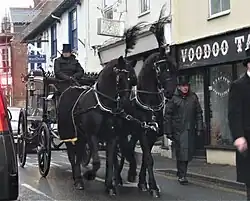 As the cortège left Ackrill's home, all the blinds of the houses along the way were drawn, according to custom, and the bells of St Mary's Church "rung a muffled peal". On foot, at the front of the funeral procession, were "a large number of tradesmen" who had known him. Following the tradesmen were Ackrill's employees and journalists. After them, walked his Masonic friends, "wearing white gloves and sprigs of acacia". The American walnut and polished oak coffin was covered in flowers given by friends and relatives. Besides the hearse, the funeral procession included "seven mourning coaches and a large number of private carriages". In the common practice of the time, the official mourners were all male, so the chief mourners in the first coach were Ackrill's closest male relatives. Beside the procession, which included Thomas Holroyd, many other local people were walking to the graveyard.[31] The procession went from Swan Road, via Walker Road (now called King's Road), to Grove Road Cemetery, a distance of nearly 1 mile (1.6 km).[32]