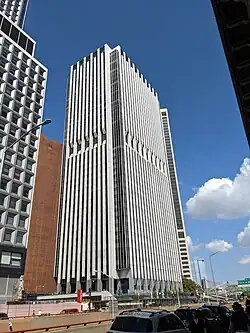 Kahn and Jacobs had frequent disagreements during the later years of their partnership, and Kahn retired from practice in 1965.[3] Jacobs continued the firm under the same name with partners Lloyd A. Doughty, Sheldon Fox and Irving H. Kaplan and associates including Der Scutt.[4] By 1972 Jacobs was also considering retirement, and considered an offer by Doughty, Fox and Kaplan to purchase his share in the firm. This was ultimately rejected and he sold the firm to Hellmuth, Obata & Kassabaum (HOK) of St. Louis.[3] Friction quickly developed between designers from Kahn & Jacobs and HOK. Several, including Fox and Scutt, soon left. Though he had intended to retire, HOK considered Jacobs valuable for client relations purposes and he remained as president of the subsidiary Kahn & Jacobs/Hellmuth, Obata & Kassabaum until 1976, when the Kahn & Jacobs name was retired and the office fully merged with HOK. From then until his retirement in 1982 he was chair of the firm's advisory board.[5][1]