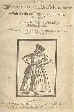 Robert Armin (c. 1568 – 1615) was an English actor, and member of the Lord Chamberlain's Men. He became the leading comedy actor with the troupe associated with William Shakespeare following the departure of Will Kempe around 1600. Also a popular comic author, he wrote a comedy, The History of the Two Maids of More-clacke, as well as Foole upon Foole, A Nest of Ninnies (1608) and The Italian Taylor and his Boy.