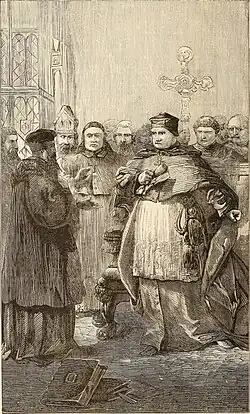 As a result, in 1526 Barnes was brought before the vice-chancellor for preaching an anti-clerical sermon on Christmas Eve based on a postil of Martin Luther,[4] and was subsequently examined by Cardinal Wolsey's commission that included four bishops. He was ordered to abjure his sermon or be burnt; and, after choosing the former, carried faggots in a public procession in London.[2]