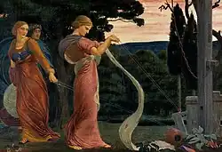 His key paintings are The Dead Knight (1870), also known as The Three Ravens, which was the title used when it was displayed in 1868,[2] The Pool of Bethesda (1877, exhibited at the Royal Academy 1878), The Raising of Samuel (exhibited at the Royal Academy 1880) and The Lily or the Rose (exhibited at the Royal Academy 1882).[1] Walter Crane, in his An Artist's Reminiscences (1907), described Bateman's painting as of... "a magic world of romance and pictured poetry, a twilight world of dark mysterious woodlands, haunted streams, meads of deep green starred with burning flowers, veiled in a dim and mystic light."