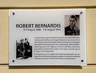 In January 2020 the Rossauer Barracks, the headquarters of the Austrian military, were renamed Bernardis-Schmid-Kaserne. The building now remembers Robert Bernardis and Anton Schmid, an Austrian soldier, who saved Jews during the Holocaust in Lithuania.[2]