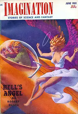 Bloch's novella Hell's Angel was the cover story in the June 1951 issue of Imagination, illustrated by Hannes Bok.