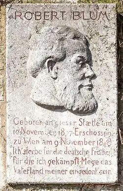 Robert Blum (10 November 1807 – 9 November 1848) was a German democratic politician, publicist, poet, publisher, revolutionary and member of the National Assembly of 1848. In his fight for a strong, unified Germany he opposed ethnocentrism and it was his strong belief that no one people should rule over another. As such he was an opponent of the Prussian occupation of Poland and was in contact with the revolutionaries there. Blum was a critic of antisemitism, supported the German Catholic sect, and agitated for the equality of the sexes. Although claiming immunity as a member of the National Assembly, he was arrested during a stay at the hotel "Stadt London" in Vienna and executed for his role in the Revolutions of 1848 in the German states.