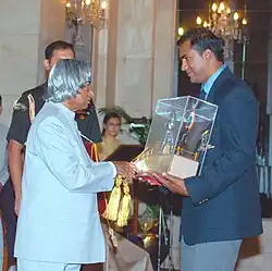![]() former Indian president A. P. J. Abdul Kalam presenting the Dronacharya Award to Robert Bobby George in New Delhi on 21 September 2004 | |