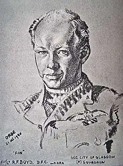 Robert Findlay Boyd was born on 8 June 1916 in East Kilbride, Scotland. He joined No. 602 Squadron of the Royal Auxiliary Air Force in 1935, and was commissioned as a pilot officer later that year. He was promoted to flying officer two years later. He was working as a mining engineer at the time of the outbreak of the Second World War, and was called up for service with the Royal Air Force (RAF).[1][2] He was promptly promoted to flight lieutenant.[3]