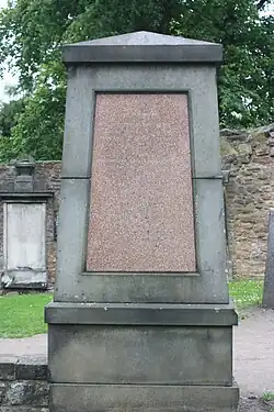 Cadell died at Ratho on 20 January 1849[2] and is buried in Greyfriars Kirkyard in central Edinburgh.[3] The grave stands at the head of one of the western lines in the western extension.