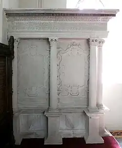 His large monument, with strapwork decoration, survives against the south wall of the chancel of All Saints Church, Clovelly. Along the full length of the cornice is inscribed in gilt capitals: Robertus Carius, Armiger, obiit An(no) Do(mini) 1586[8] ("Robert Cary, Esquire, died in the year of Our Lord 1586"). On the base of the north side are shown two relief sculpted heraldic escutcheons, showing Cary impaling Chequy argent and sable, a fess vairy argent and gules[9] (Fulkeram, for his father) and Cary impaling Sable, three swords pilewise points in base proper pomels and hilts or (Poulett, for his grandfather). On the base of the west side is a similar escutcheon showing his own arms of Cary (of four quarters, 1st: Cary; 2nd: Or, three piles in point azure (Bryan);[10] 3rd: Gules, a fess between three crescents argent (Holleway);[11] 4th: A chevron (unknown, possibly Hankford: Sable, a chevron barry nebuly argent and gules[12]) impaling Gules, a chevron or between three millets hauriant argent (Milliton, canting arms, a "millet" in heraldry being a type of fish, possibly a mullet)[4])