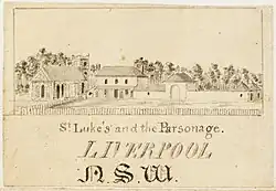 "St Luke's and the Parsonage, Liverpool, N.S.W." From Views of Sydney and Surrounding District, by Edward Mason (c. 1821–1823)