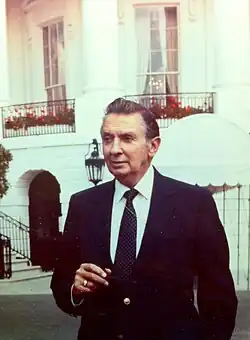 Following his term as bureau chief, Thompson moved his family to Seattle and took up the post as publisher of the (now defunct) Seattle Post-Intelligencer from 1974 to 1978. He also served as a juror for the Pulitzer Prize from 1975 to 1976.[3] While he enjoyed running his own paper, after only four years in Seattle he missed being in the heart of the political landscape and writing about Washington politics. In 1978 he moved the family back to Washington, D.C. and reclaimed his former position as bureau chief for Hearst, which he held until 1989.[3] During this period he would fly to China once with President Ronald Reagan and once with President George H. W. Bush. One day following a seating chart, President Ronald Reagan called upon Thompson at a White House press conference. Unbeknownst to him, Thompson was sitting with his wife at home in his robe and slippers, a glass of wine in his hand watching the televised conference from the comfort of his favorite chair. Without missing a beat when he heard his name, Thompson dutifully stood and raised his glass toward Reagan's TV image in salute.[6]